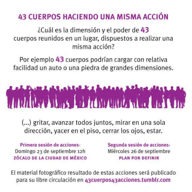 43Cuerpos es una invitación a formar parte de la reunión —de uno o más grupos— de 43 personas, dispuestas a realizar acciones simples y vitales como cerrar los ojos, mirar en una dirección, yacer juntos... Una forma de volver a hacer palpable la dimensión y poder de 43 cuerpos reunidos por un mismo propósito. VEN CONTIGO CON OTROS COMPARTE.